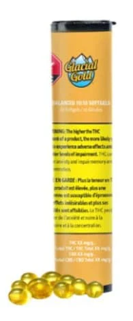 Glacial Gold Balanced 10:10 Softgels feature certified-organic MCT oil derived from coconuts, infused with high-purity THC and CBD distillates from Nextleaf Labs. Available in a convenient trial size 10-pack providing 100mg total THC and 100mg total CBD per package.