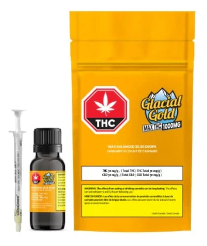 Glacial Gold MAX THC Drops feature high-purity THC and CBD distillate mixed with organic MCT oil from coconuts. Their maximum-strength, 60mg/g balanced formula provides 1000mg THC and 1000mg CBD in every 35ml bottle.
