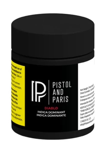 The mysterious and enigmatic Diablo flower, thought to be a cross of MKU and Bubba Kush, greets you with an intense, peppery diesel aroma. Diablos dense, sticky buds are a medium green and coated in resinous trichomes, making it a cultivar that won't disappoint indica lovers. Its terpene profile includes myrcene, caryophyllene, and limonene. Pistol and Paris flowers are true craft, always produced with love and care, employing methods such as whole-plant hang-dry, cold-cure, and hand-trim. Every step is done by hand to ensure the delivery of a premium experience.