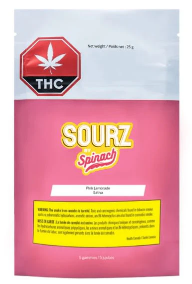 It always tastes like summertime with Pink Lemonade SOURZ by Spinach. With sweet raspberry and refreshing lemonade flavours, this dual-flavoured soft chew blasted with sour crystals is over-the-top with natural flavours. Five pieces per pack with 10mg THC total.