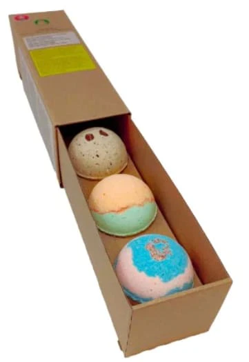 A triple box featuring three uniquely scented, handcrafted, and ultra-moisturizing bath bombs with 100mg CBD and 100mg THC per fizzy sphere. Double Dream features soft and relaxing floral notes, Citrus Farmer features an uplifting citrus aroma, and Kaya's Koffee features a warm, mocha-inspired aroma. Stewart Farms bath bombs are hand-pressed with care and designed without synthetic perfumes, fragrances or alcohols, and packaged in biodegradable materials