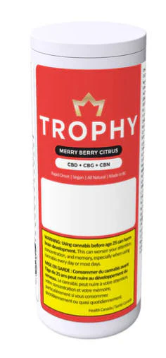 Trophy Wellness Merry Berry gummies are 6g with a total of 5mg CBD, 5mg CBG and 5mg CBN per gummy totaling 100mg of each cannabinoid (CBD, CBG, CBN) per package. This unique flavour profile combines the sweet flavour of clementine oranges with distinct notes of raspberry and cherry berries. These gummies are manufactured in-house at Trophy using cannabis ingredients from British Columbia and are made with all-natural ingredients. They are vegan, gluten-free, sulphite free and cannabis terpene enhanced.