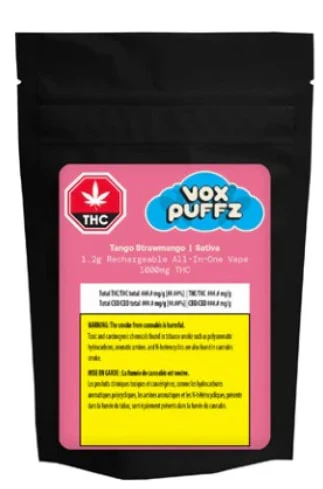 VoxPuffz Tango Strawmango rechargeable All-in-One Vapes have a Voxtastic 1000mg of THC, and are triple distilled for purity and smoothness. From your very first puff to the last, youll unleash the wildly delicious tangy strawberry and sweet, tropical mango flavour. This sativa-dominant, distillate vape contains botanical terps with 80-83% THC.