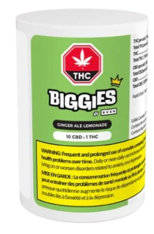 Rapid onset, high-quality BIGGIES (6g oversized gummies) using ingredients from and manufactured in British Columbia. A Canadian classic flavour which results in the refreshing, crisp, and clean taste of ginger ale paired with delicious lemonade flavour. Four-pack with a 10:1 formulation of 100mg of CBD (25mg/piece) and 10mg of THC (2.5mg/piece). BIGGIES are made with all natural ingredients are vegan, gluten-free, sulphite-free, and cannabis-terpene enhanced.