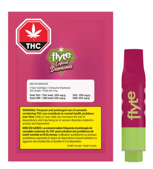 Melon Mnage from Flyte Liquid Diamonds serves up watermelon, kiwi, and melon that bursts with sweet, fruity flavour. This 1g cart blends 30% ultra-potent liquid diamonds with 70% distillate and botanical terpenes for a potency of 9197% THC. Housed in top-tier postless 510 hardware.