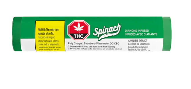 Enjoy the juiciest flavour combination of sweet strawberry and refreshing watermelon with the Spinach Fully Charged Strawberry Watermelon OG CBG-infused Pre-roll. Infused with high-quality, high-potency liquid diamond and distillate blend, botanical terpenes, and dusted with kief coating, its high at 40%+ total THC and added cannabinoid CBG. Inspired by a lineage that traces back to Strawberry OG and Watermelon OG, feel the sweet strawberry-watermelon tastes.