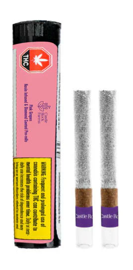 Pink Grapes Rosin Infused Glass Tip Blunts feature strain-specific inputs cultivated in Princeton, BC. These blunts contain strain specific milled flower mixed with live rosin and are generously coated in diamonds for exceptional potency. Pink Grapes was bred by crossing Pink Rntz and Grape Gas.