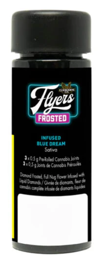Claybourne Frosted Flyers Infused Blue Dream pre-rolls are THCA diamond frosted, terpene enhanced with natural flavouring agents and infused with liquid diamonds. These three pre-rolls are sativa-dominant and boast 40-50% THC. Looking for bold flavour and a potent experience? Look no further than Claybourne Frosted Flyers.