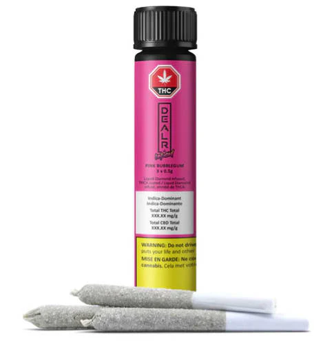 DEALR Infused Pink Bubblegum marks the debut of the brands new infused pre-roll series, and its coming out swinging. Made from the legendary Indiana Bubble Gum and the punchy Pink 2.0 this indica-dominant infused pre-roll comes fully loaded. Each pre-roll is THCA diamond frosted, enhanced with botanical terpenes and infused with liquid diamonds. It hits with a rush of sweet strawberry and candy then settles into a smooth powerful finish. Sweet, strong, and ready to turn heads, this is how DEALR enters the infused game.