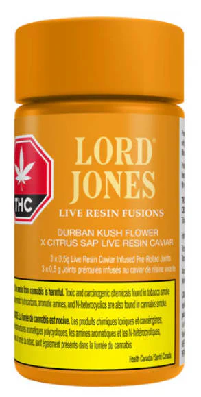 Lord Jones Live Resin Fusions are kief-coated and filled with high-potency, terpene-rich live resin and hard-hitting, single-strain flower sure to go beyond all expectations. With the Lord Jones Live Resin Fusions Durban Kush x Citrus Sap, take your tastebuds through an orchard of citrus and cedar flavours from the combination of tangy Citrus Sap live resin and Durban Kush flower. Together they create a live-resin-caviar-infused pre-roll like no other. With the addition of premium ceramic filters your smoking experience is now smoother than ever.