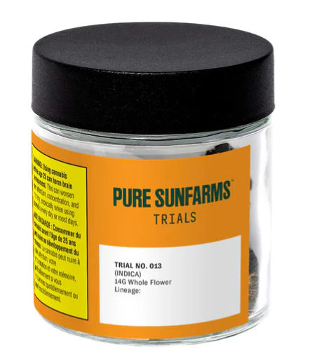 Trial No. 013 was pheno-hunted by growers for its impressive bud structure and sour aroma profile. This super sticky indica-dominant strain is an expressive cross of iconic old school White Widow x fruity legend Gastro Pop. It delivers a dank nose that hits heavy with gas on the forefront, layered with strong sour notes and a kick of spicy black pepper, balanced by a touch of sweet tangerine and fresh lemongrass from dominant terpenes myrcene, limonene, and caryophyllene. The light green buds are hefty and dense with bright orange hairs. Each Trial strain is a chance to try fresh genetics trialing in the Pure Sunfarms' greenhouse. Grown in small batches and released in limited drops—available for a limited time only.