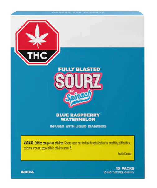 SOURZ by Spinach Fully Blasted Blue Raspberry Watermelon gummies have 10mg of THC per piece. These dual-flavoured gummies are over-the-top with natural flavours and blasted with sour crystals. Enjoy 10 gummies with 10mg of THC per gummy and 100mg of THC total per pack.