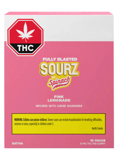 SOURZ by Spinach Fully Blasted Pink Lemonade gummies have 10mg of THC per piece and the flavours of raspberry and lemonade! These dual-flavoured gummies are over-the-top with natural flavours and blasted with sour crystals. Enjoy 10 gummies with 10mg of THC per gummy and 100mg of THC per pack.