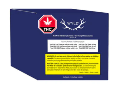 Wyld Elderberry indica-dominant THC:CBN gummies are a 2:1 product featuring a balanced dose of CBN. Made using real fruit, botanical terpenes and natural flavours. Each gummy contains 10mg THC and 5mg CBN for a total of 100mg THC and 50mg CBN per pack All Wyld gummies are packaged in compostable pouches and provide consistent experiences. Each Wyld Elderberry Indica Enhanced gummy contains 10mg THC and 5mg CBN combined with the terpenes myrcene, linalool, beta-caryophyllene, and terpineol.