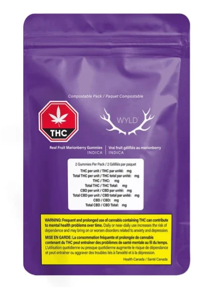 Wyld Marionberry Indica gummies are sustainably made using real fruit, botanical terpenes, and natural flavours. The recipes are formulated by food scientists to provide consistent experiences. Wyld gummies use sunflower lecithin to improve bioavailability and onset time and are made to be thermostable up to 60C, with a firm texture that doesnt stick to your teeth. Each Wyld Marionberry Indica gummy contains 5mg of THC combined with the terpenes myrcene, linalool, and beta-caryophyllene.