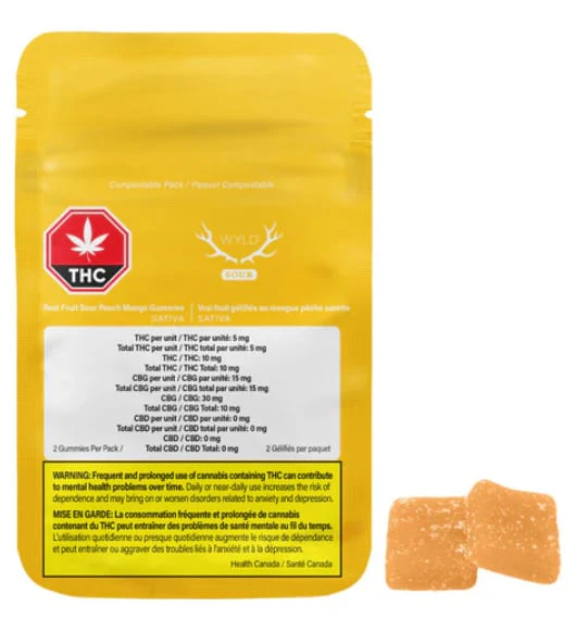 Wyld Sour Peach Mango Sativa Enhanced CBG:THC gummies are a 3:1 ratio product featuring a restorative, CBG-dominant profile and THC. Made sustainably using real fruit, botanical terpenes, and natural flavours, each gummy contains 15mg CBG and 5mg THC for a total of 30mg CBG and 10mg THC per pack. All Wyld gummies are packaged in a compostable pouch, and their recipes are formulated by food scientists to provide consistent experiences that taste amazing. Wyld gummies use sunflower lecithin to improve bioavailability and onset time and are made to be thermostable up to 55C, with a firm texture that doesnt stick to your teeth. Each Wyld Sour Peach Mango Sativa Enhanced gummy contains the terpenes limonene, valencene, alpha-pinene, and beta-pinene. Wyld is proud to be a Climate Neutral Certified brand.